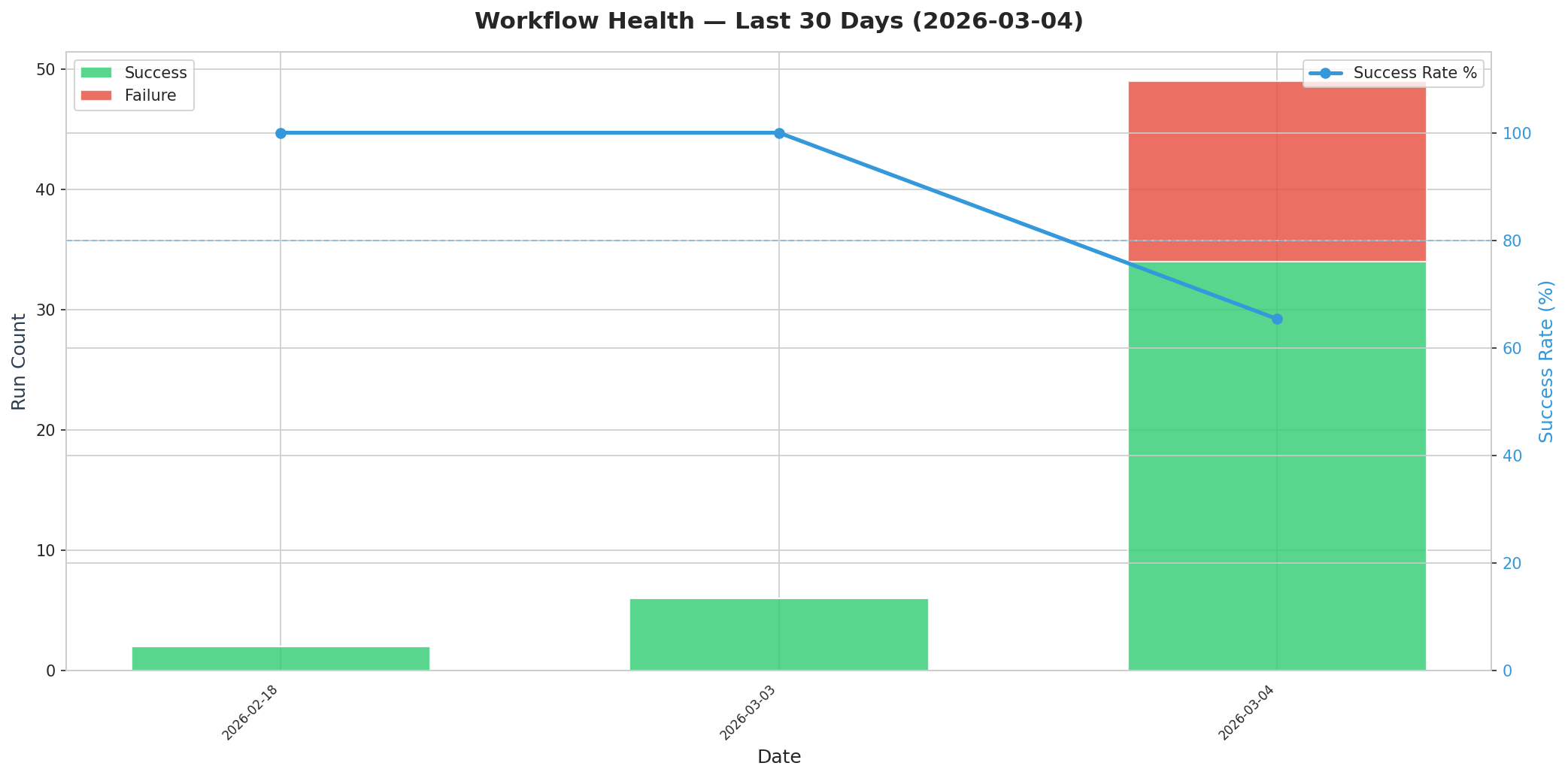 52 workflow runs analyzed in the last 24 hours. The overall success rate was 65% — significantly below healthy baseline — driven primarily by a persistent OpenAI API restriction affecting all Codex-based workflows.