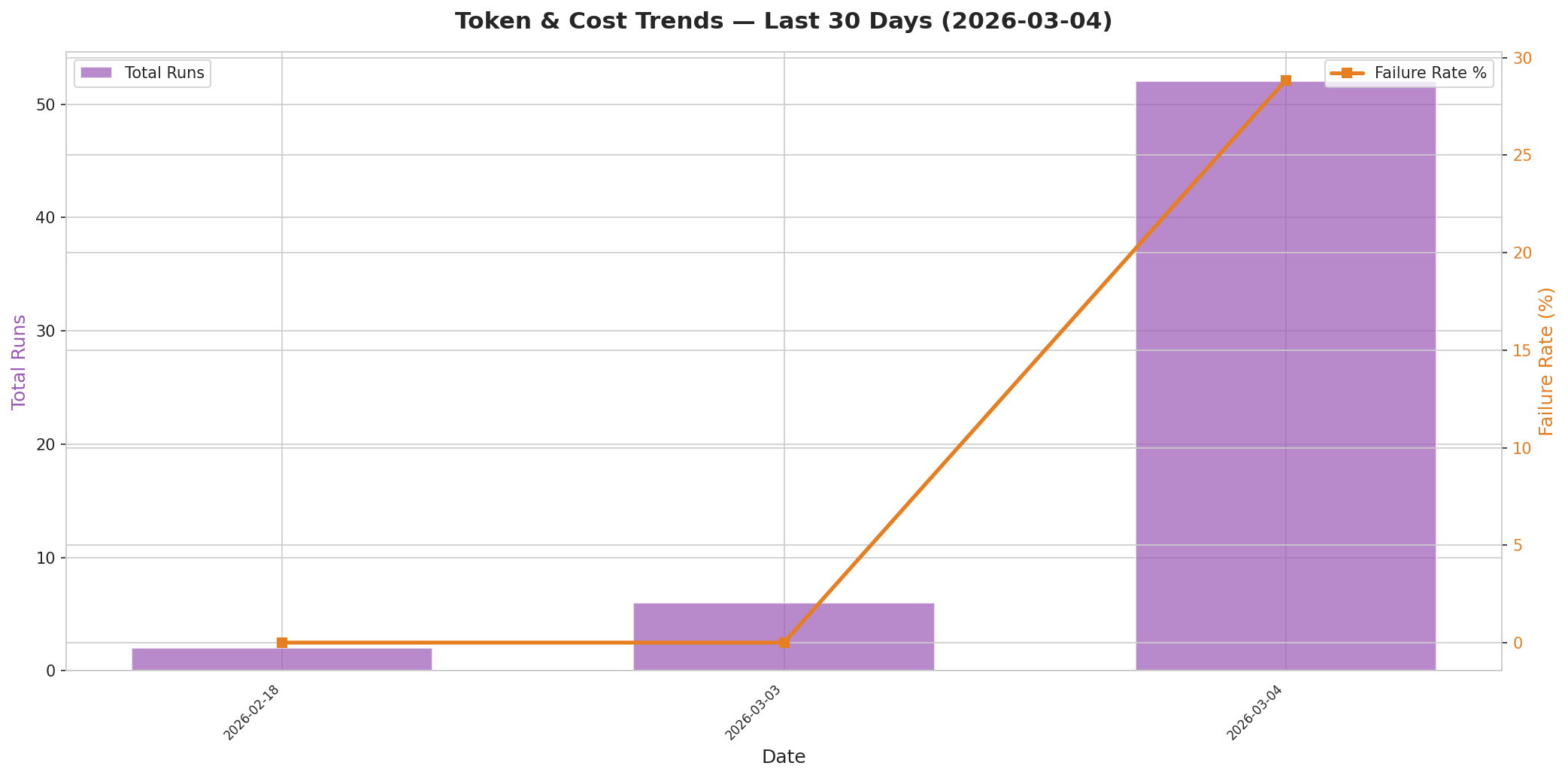 Token/cost data is not yet populated in run summaries (all zero), so the chart shows failure rate over total runs. The spike on 2026-03-04 reflects today's Codex API issues.