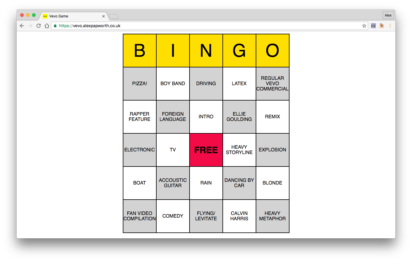 Vevo Bingo AKA Music Video Drinking Game Drinking game for Vevo TV. 2 - 4 players. Rules Take a sip when someone makes a match. Finish your drink when someone wins. Recommended drinks Mojito Champagne Rum and Coke Demo: https://vevo.alexpapworth.co.uk/