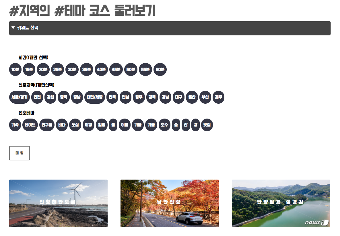 - 키워드(시간, 지역, 테마)를 선택하면, 해당하는 코스를 보여줍니다.