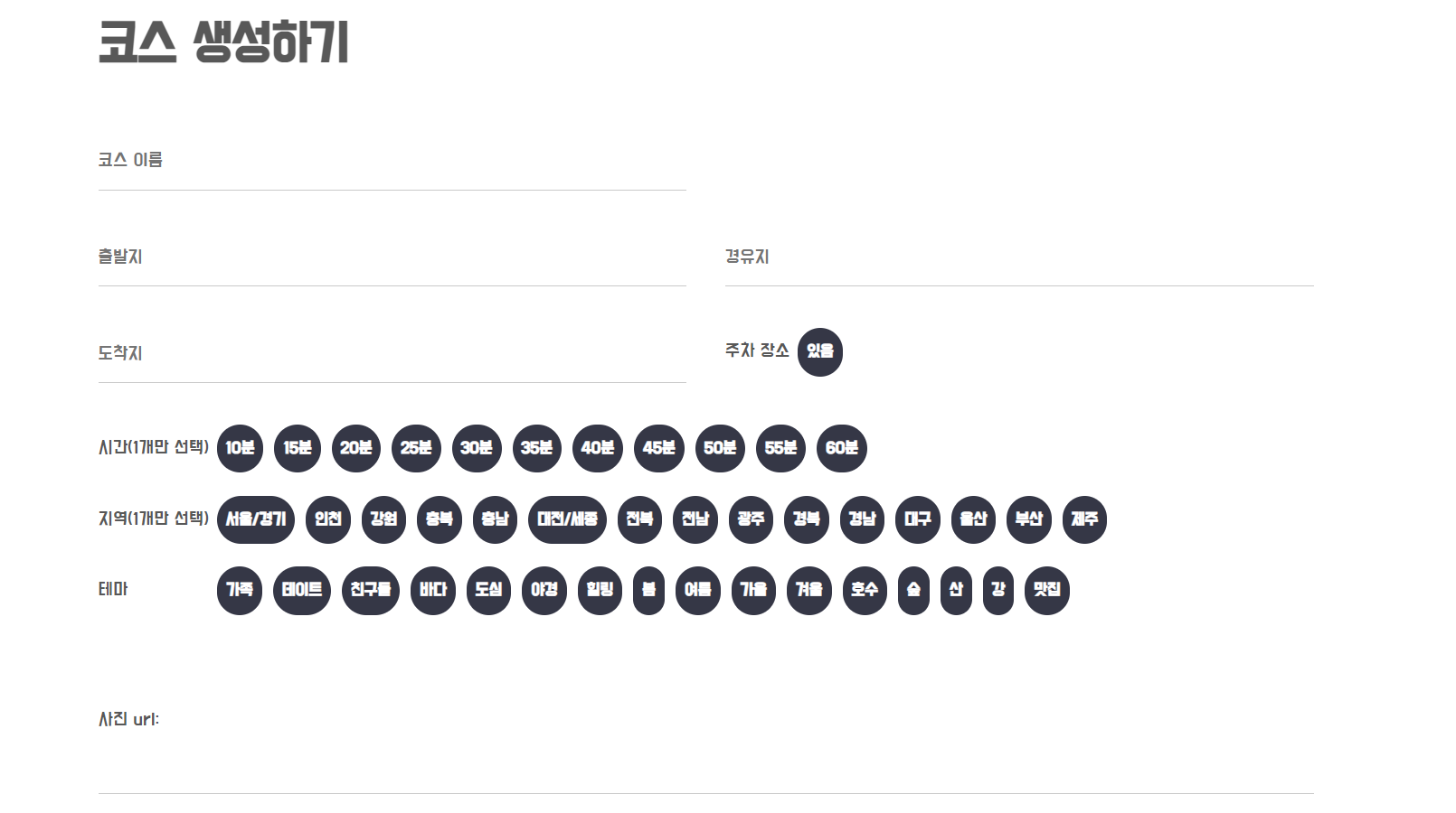 - 필수 요소(코스 이름, 시간, 지역, 테마)를 입력해야 합니다.