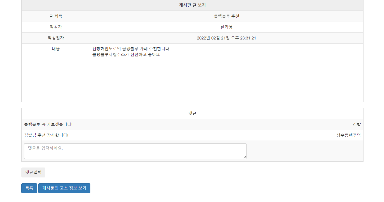- 주변 갈만한 곳 : 해당 코스 주변의 맛집을 볼 수 있는 게시판의 게시글 목록으로 이동합니다. (MoveCourseController)