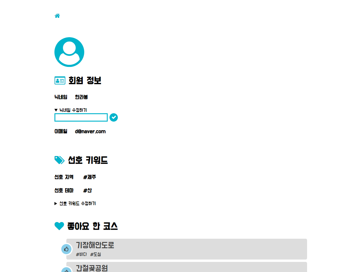 - 좋아요 한 코스 : 좋아요를 누른 코스들을 모아서 볼 수 있습니다.