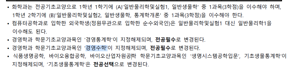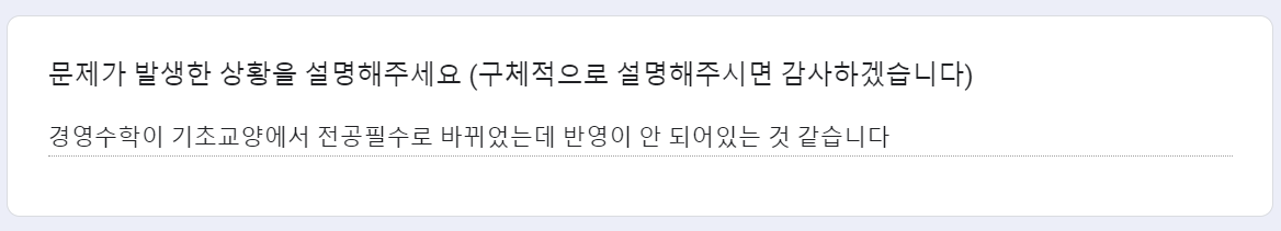 <img width="584" alt="image" src="https://user-images.githubusercontent.com/71180414/185870630-78cced65-3e1e-4f23-b85d-50fd3723e882.png"> 구글폼 문의가 들어와서 수강편람 뒤져봄 <img width="565" alt="image" src="https://user-images.githubusercontent.com/71180414/185870862-5ff9eacb-1fa2-436f-acf0-5fc956c878b0.png"> 세사봉/창기와 같이 기이수성적에 찍히는 이수구분과 실제 인정 이수구분이 다른 상황 ... 근데 이건 또 특정 학과에만 해당되는거라 changed_classification 테이블로 해결이 불가능 standard에서 필수 과목엔 빠져 있어 요건 검사는 괜찮음 단 '기교'로 찍힌 과목을 '전공'으로 인정받고 싶은 상황