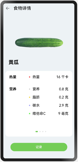 以及展示单位重量的食物所包含的热量、脂肪、蛋白质、碳水以及维他命C值;并且点击记录按钮可以弹出记录饮食的弹窗,包括记录食物的种类、重量以及用餐时间,