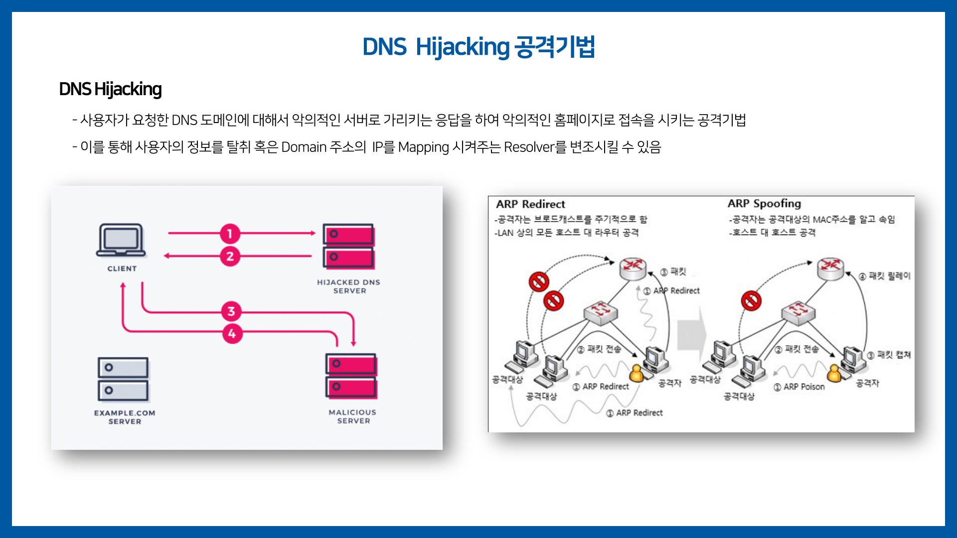 Network-Project-Intern [2020.06 - 2020.09] 보안 솔루션 개발 인턴 프로젝트 1. ARP 패킷 캡쳐 모니터링 2. Simple DHCP 서비스 네트워크 대역 내 HOST들의 DHCP 요청을 받아서 IP 및 여러 정보를 제공하는 서비스 최종적으로 Simple DHCP Service로부터 동적으로 IP를 할당 받은 Host는 네트워크 통신이 가능 3. DNS Hijacking 공격 시연 + Packet Relay DNS 하이재킹 공격 시연 하이재킹 하지 않는 대상은 정상적으로 패킷 릴레이 시켜주도록 개발
