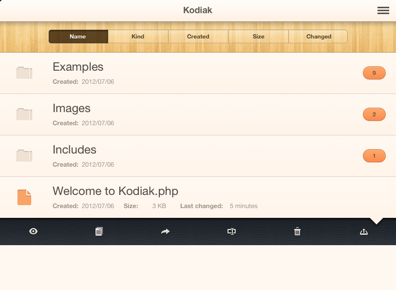 This component is an extended UITableView, suited for showing files and directories. It can display additional information, like date of creation and file size. When an item is selected it shows a toolbox under it. It was developed for Kodiak PHP, an app which allows you to write and run PHP code directly on the iPad.