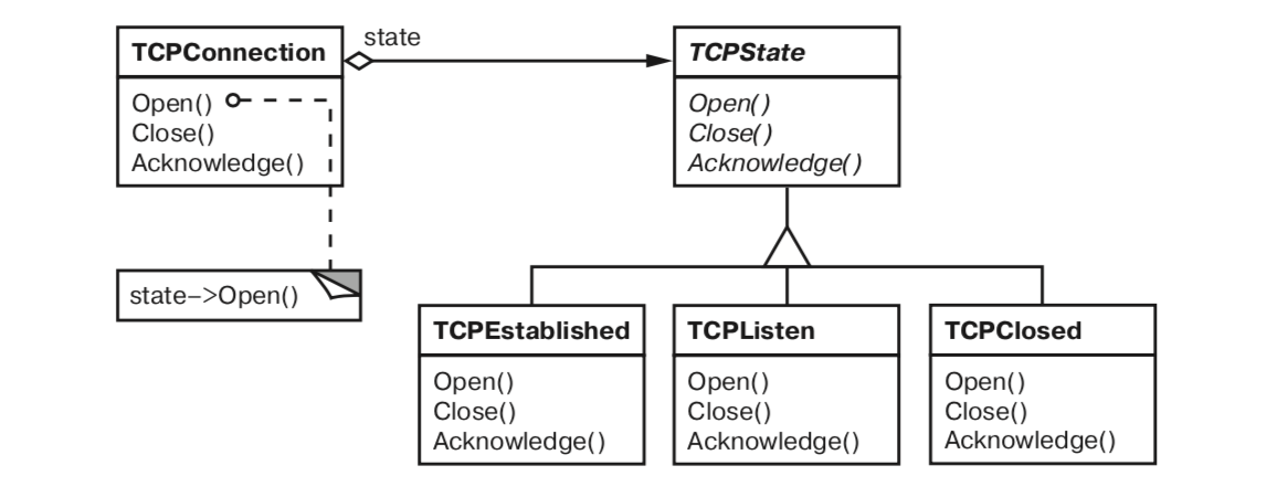 Класс TCPConnection хранит у себя объект состояния (экземпляр некоторого подкласса TCPState), представляющий текущее состояние соединения, и делегирует все зависящие от состояния запросы этому объекту. TCPConnection использует свой экземпляр подкласса TCPState для выполнения операций, свойственных только данному состоянию соединения. При каждом изменении состояния соединения TCPConnection изменяет свой объект состояние. Например, когда установленное соединение закрывается, TCPConnection заменяет экземпляр класса TCPEstablished экземпляром TCPClosed.