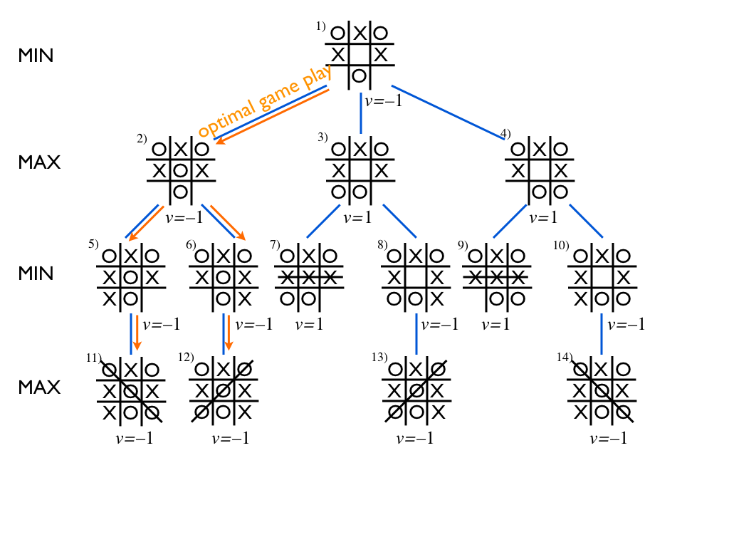 A classic Min Max is implemented. Here the evaluation of a board is the difference between the number of winning states. Thus we only need to consider the