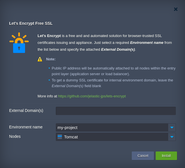 Try out the Let’s Encrypt SSL add-on with Jelastic Multi-Cloud PaaS for Java, PHP, Node.js, Ruby, Python, .NET, Go, Docker Swarm and Kubernetes clusters.