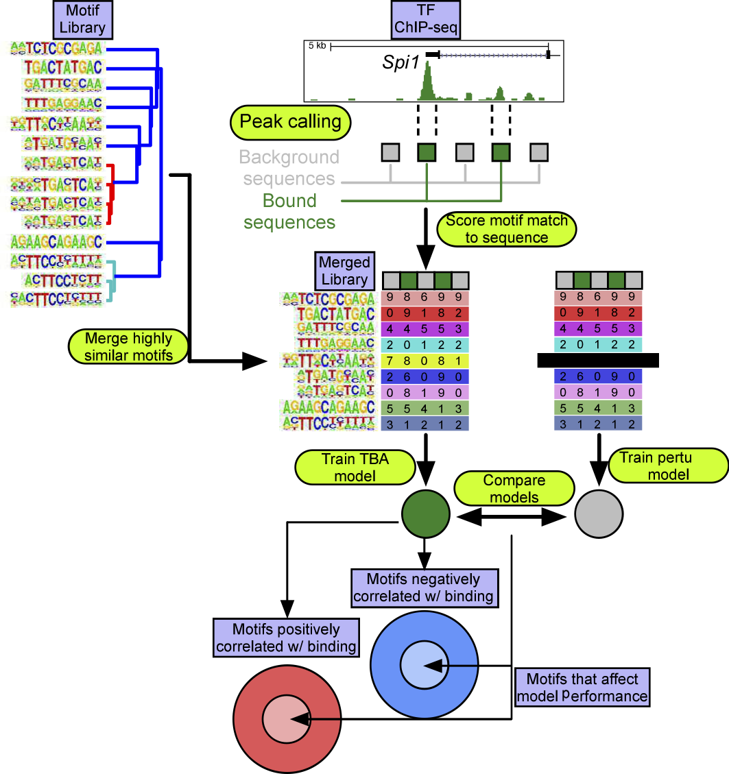 TBA takes a set of loci that are of interest as input. First, the genomic sequence of each loci of interest are retrieved. Next, TBA selects a set of GC-matched background loci. For each locus of interest and background locus, TBA calculates the best match to hundreds of DNA binding motifs, and quantifies the quality of the match as the motif score (aka log likelihood ratio score). To allow for degenerate motifs, all motif matches scoring over zero are considered. The motif scores are then used to train the TBA model to distinguish loci of interest from background loci. TBA scores the probability of observing binding at a sequence by computing a weighted sum over all the motif scores for that sequence. The weight for each motif is learned by iteratively modifying the weights until the model’s ability to differentiate binding sites from background loci no longer improves. The final motif weight measures whether the presence of a motif is correlated with TF binding.