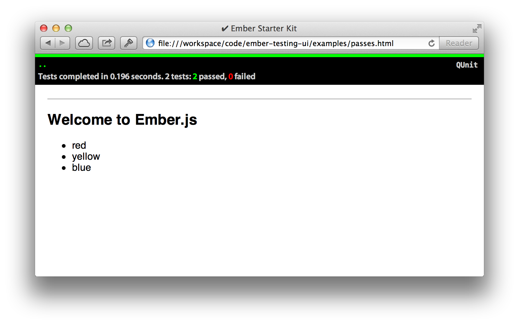 A JS and CSS file to be included with your QUnit test runner. It modifies the look of the the test runner to make integration tests using ember-testing very pleasant.