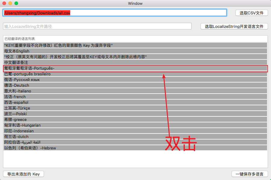 CSV文件读取已经翻译的内容一键保存到指定的.Strings文件里面 - 支持查看某种语言未翻译和已翻译部分