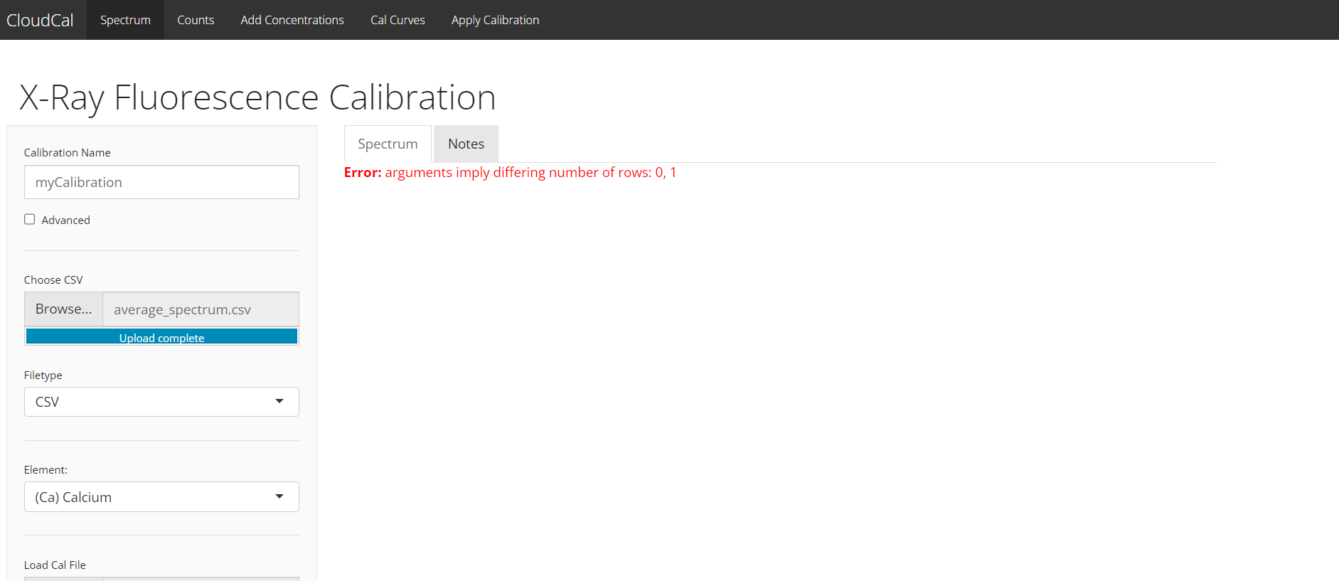 I have run into a couple errors when using CloudCal to make analysis. Once the 'CSV' file was uploaded to make analysis I received an error which states, 'arguments imply differing number of rows: 0,1'.