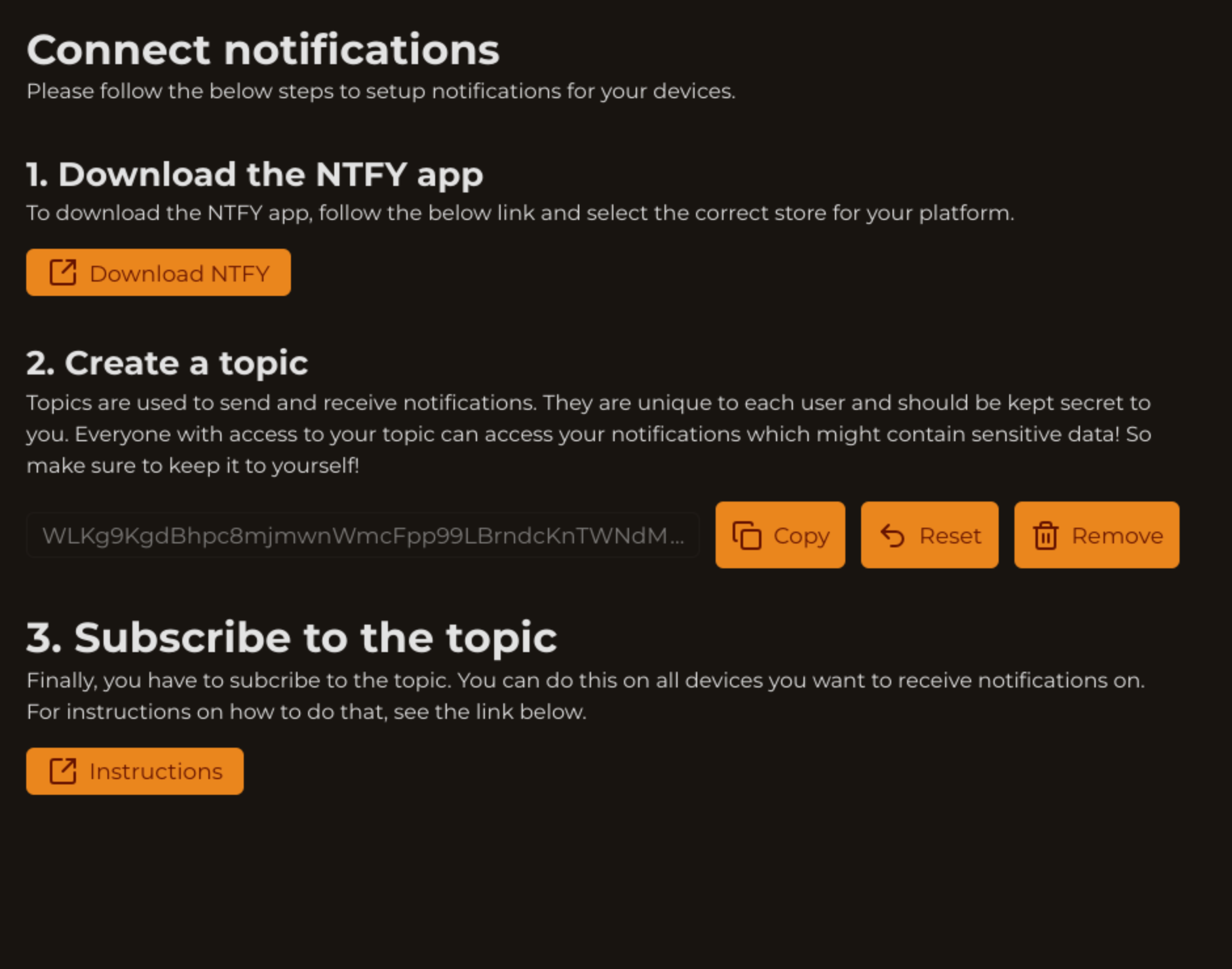 - They can generate a secure random string which will be used as a ntfy topic. Additionally, there is some guidance on how ntfy can be installed and used so people unfamiliar with ntfy won't be overwhelmed