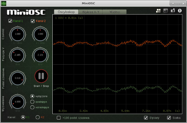 Prosty wirtualny oscyloskop pobierający sygnał z dwóch kanałów wejścia mikrofonowego karty dźwiękowej.