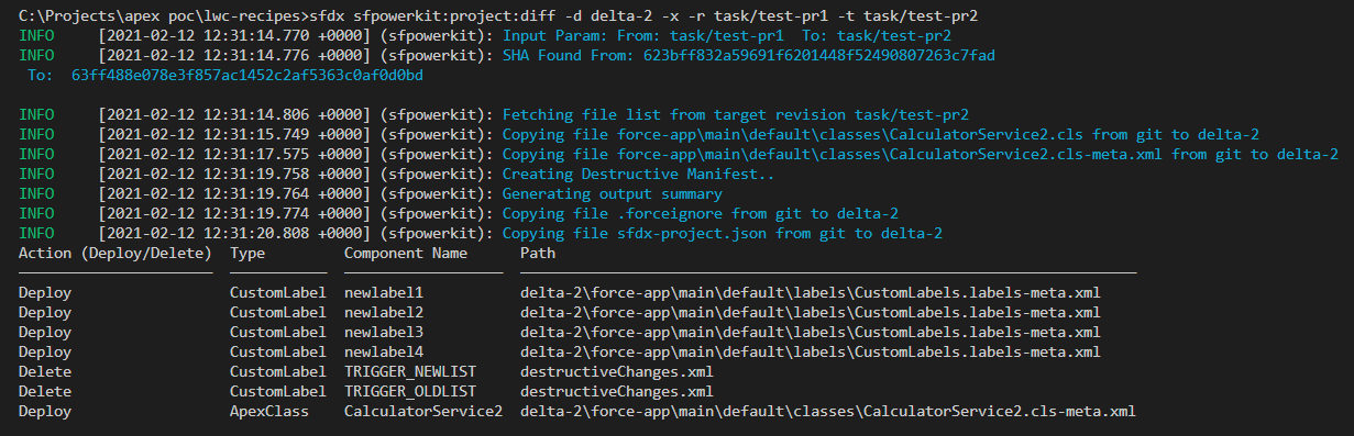sfdx sfpowerkit:project:diff -d delta-2 -x -r task/test-pr1 -t task/test-pr2