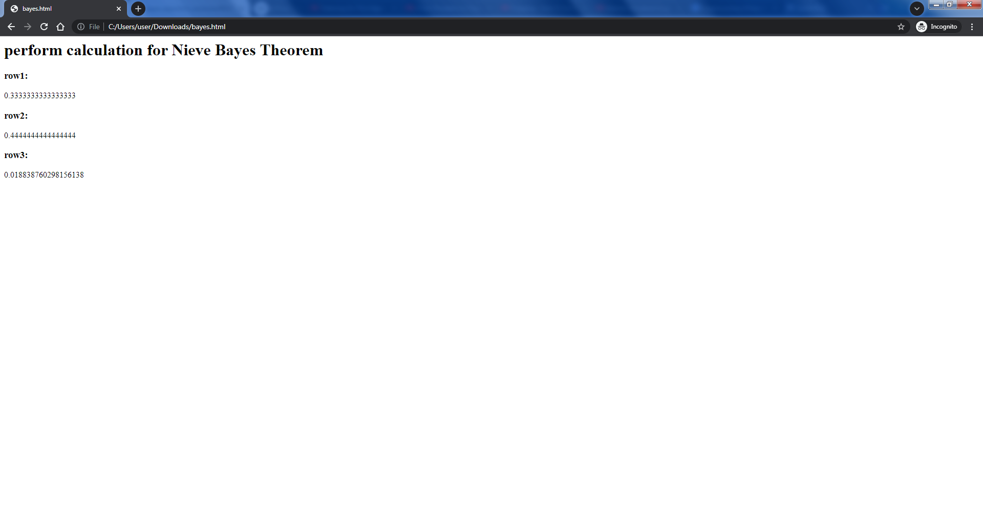 Below is an example of using the Bayes Algorithm. The data will come from a list you will want to iterate over in the application. You may want to use one array of data and search for a pattern (B|A). You need to search for occurrences of B, but not include (B|A), which is how we get the B_in_common and why we subtract the A_num from the total_size to compute the common_num.