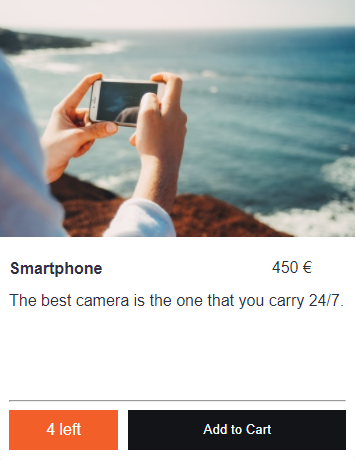 The single product card holds the name, the price and a short description of the product. Below the description there is also a highlighted number of how many products are left in stock and the "Add to Cart" button.