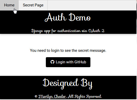 This app is deployed on AWS running SSL here. This app contains a secret page whose secret content can only be viewed after authenticating with GitHub.