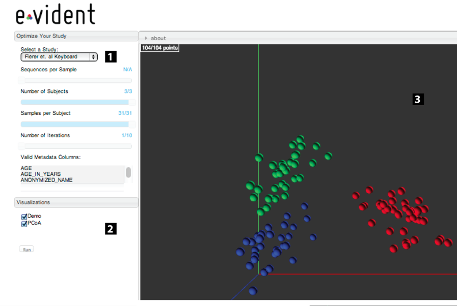 Evident is a web-based software tool with an interactive user interface, implemented in HTML, Web Graphics Library, mod_python and Quantitative Insights Into Microbial Ecology (QIIME). The interface of E-vident (Fig. 1) is comprised of: (i) the selection of parameters (i.e., study of interest, number of sequences per sample, the number of samples to use, and the number of iterations); (ii) the kind of visualizations to generate (Demo PCoA shows the original results from the study, and PCoA recalculates the study using the user-defined parameters in (i); (iii) the WebGL plot display.