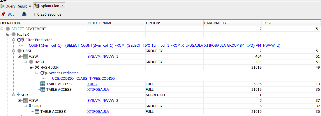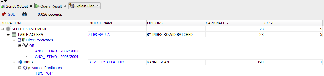 CREATE INDEX IX_ZUCS_CODIGO_CURSO ON ZUCS(codigo, curso);The first one is useful since the tipo column from ZTIPOSAULA is used in the HAVING clause to determine if a course has all types of classes. This makes the HAVING statement have a cost of 13 instead of 37. In spite of this, the total cost of the query won't change with this index.