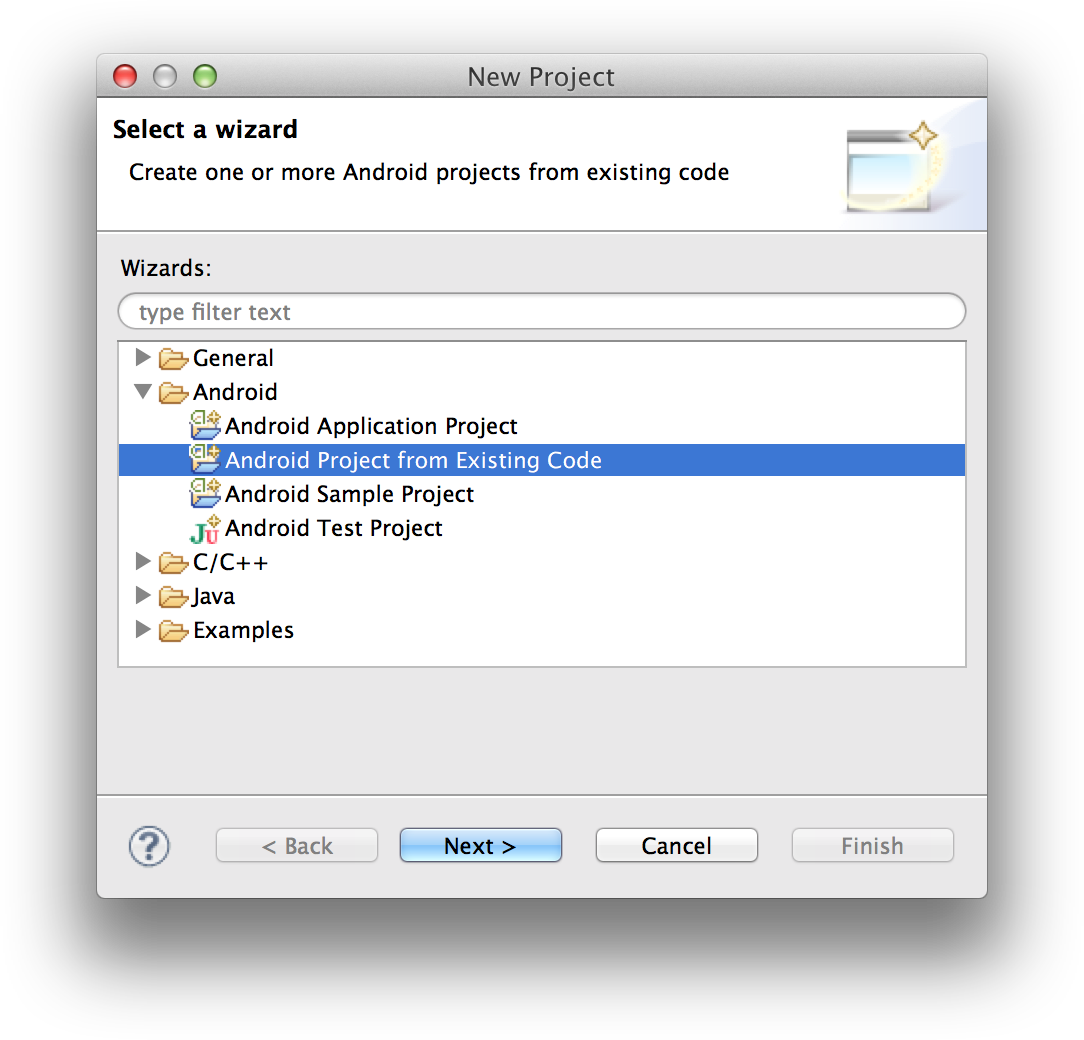 From the Wizard expand the Android group and select Android Project from Existing Code and click Next.