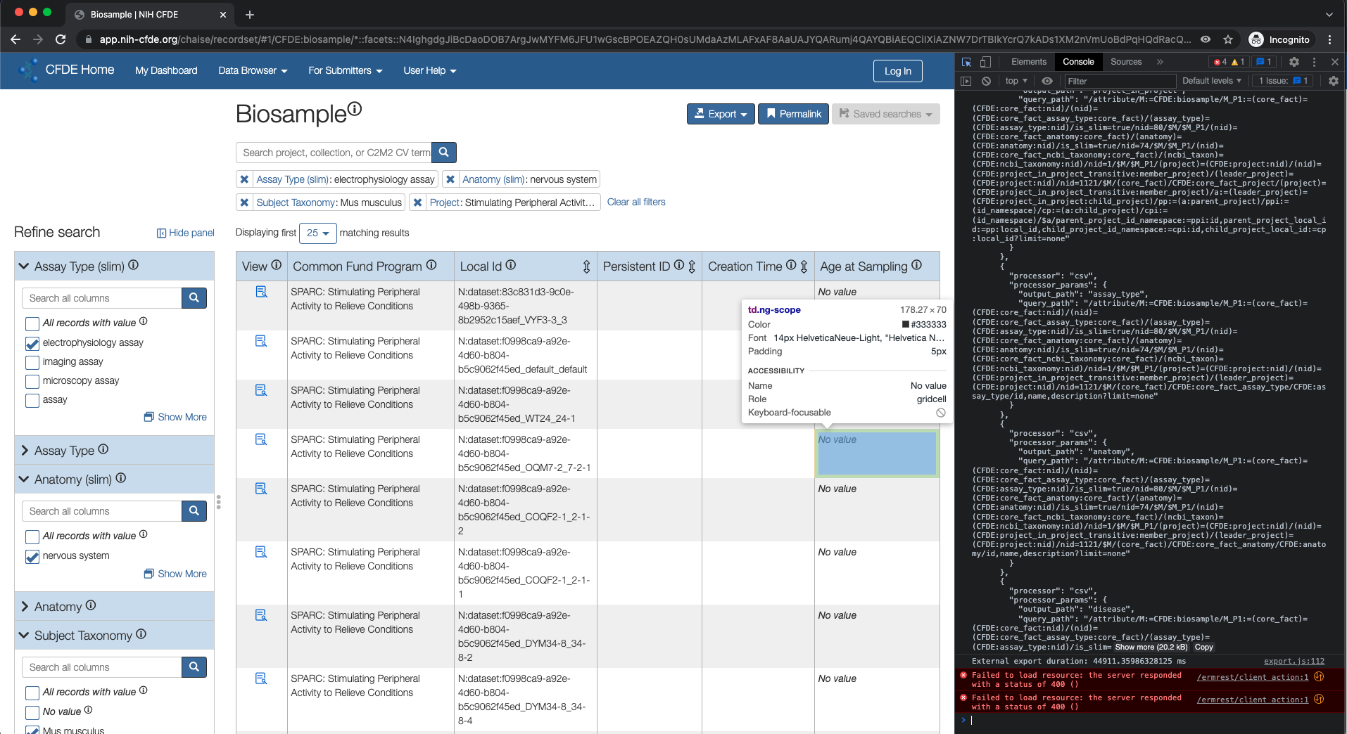 https://app.nih-cfde.org/chaise/recordset/#1/CFDE:biosample/*::facets::N4IghgdgJiBcDaoDOB7ArgJwMYFM6JFU1wGscBPOEAZQH0sUMdaAzMLAFxAF8AaUAJYQARumj4QAYQBiAEQCiIXiAZNW7DrTBIkYcrQ7kADs1XM2nVmUoBdPqHQdRacQilzFys+svbd+wxMtHT0DY3NrEDt+EBYBABsOHAwqASRaJHiBAFslEBQTDEgoWiMwDiSMCCoODDQ8PhAIARgbLwALFAFcJHwADgAGaOR0bDwEEeIcSNgaekZzDR4YoWdXeHcFPO8LTUhylGz9HY0rCij7fLQnMRg3GS2vBZ89iAOjrTeOQ-0WSOHYglKql0pkcnkCsliqVypVqrNavVlk0WlEOl0evgAOwAFgBRDG+EmYxmcxOnGWghEtwkD08Kmeu1oECwwgEBjAAA8UBAfvM1Ey-ucAY41ncNnTtozTiy2RzubyPrL2RwuTyzrZGs1WujujheggAIz40a4ImEU3Tc6zOhGDAoABWOApl1WNPuHjydsdzs0QlK9qdllqkCQAg4AgAbsxsjhssJkhqLjFRe6JZ7lN6g36IAGfcGihAwxHo7R4jgwFBE0LNcptWiVJ09Qb4IbDQAmY3cOxAA@sort(core_fact,nid)