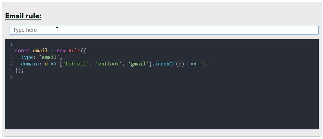 someRule.test(invalidValue) // returns false2 Please if you think a comment is a good feature to be added like the comment instead of creating a new one.