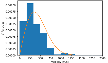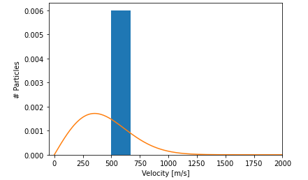 In the beginning of the simulation the histogram shows that all the particles start at the same speed as shown in the first image and as time develops by the end the distribution of velocities truly does approach a lot more the Maxwell-Boltzmann Distribution: