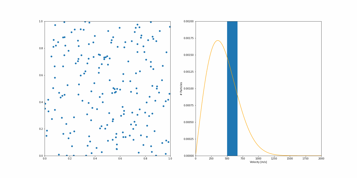 The Maxwell-Boltzmann Distribution is a Probability distribution that describes the distribution of speeds in a ideal gas in thermal equilibrium, where the particles move inside it freely, following the ideias set out by the kinetic theory of gases, as shown above. The simulation will seek out to approach it as best as possible this distribution.