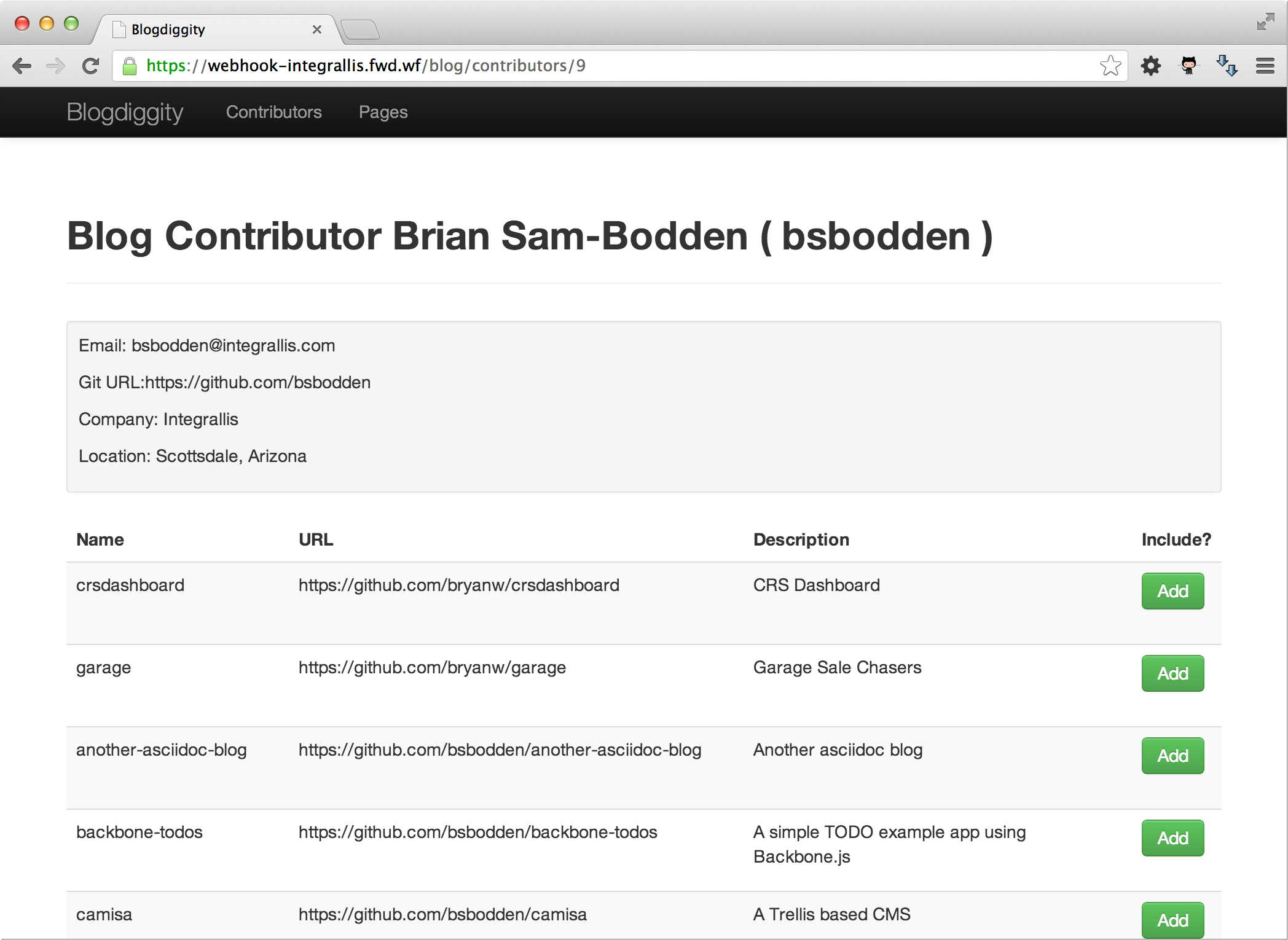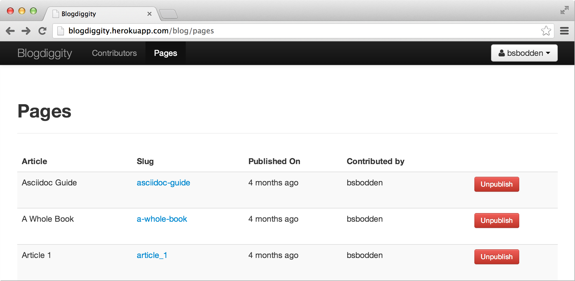 Blogdiggity is a minimalist Rails Blog powered by Git (Github in particular) and Asciidoc. The premise behind Blogdiggity is that you should never have redeploy your app to add, modify or delete blog entries. We (the Integrallis Team) are sick of dealing with database-driven blog engines. In most cases they are slow and bloated and try to become mini-application frameworks which ends up feeling pretty invasive. Blogdiggity deals with one format and one format only; AsciiDoc (http://www.methods.co.nz/asciidoc/). When you add, remove or make changes to an article on the repo, those changes are automatically reflected on your site using the magic of Github post receive hooks (https://help.github.com/articles/post-receive-hooks). Articles are never stored on your app’s db. They are read directly from the repo, rendered into HTML using AsciiDoctor (https://github.com/asciidoctor/asciidoctor) and cached until a post receive hook invalidates the cache, making page loads very fast!