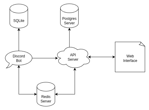 - API Server - The "brain". Responds to REST calls from the Discord Bot and the Web Interface. Uses the Postgres Server for storage. Communicates with the bot using RPC calls via the Redis Server. Also uses Redis for cache.