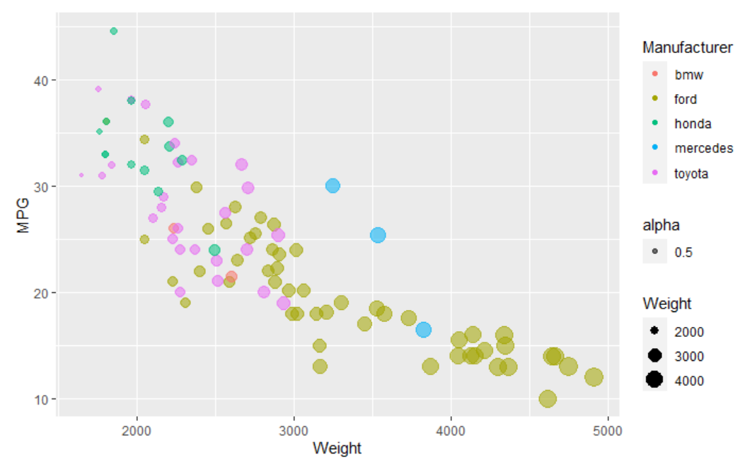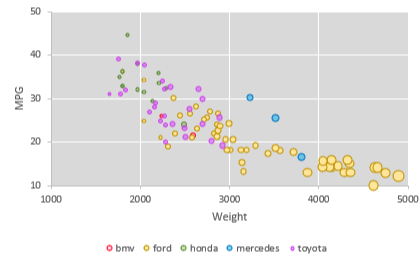 #2: Excel Excel is a spreadsheet created by Microsoft tht is able to take data and create charts. In this, I used a scatterplot to create the chart, using the data we had and creating additional extra rows to ensure the Manufacturer color was being calculated correctly. This graph was created and I tried my best to keep the colors similar to the original ones for the different manufacturers. I also had the gridlines and the legend for the manufacturers on this graph. The main issue I had with this one was that I struggled to change the size based on the data and ended up having to manually change them to accurately reflect the differences in weight. There was also a limitation were I could not change where the axis started without messing up the ticks and went as close as possible to the original (10 to 50 on the y axis and 1000 to 5000 on the x axis).