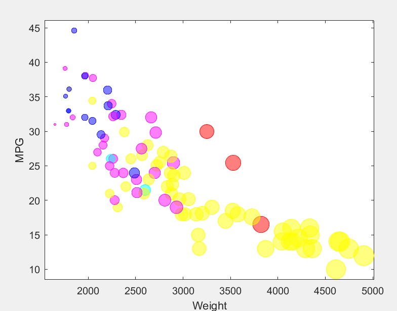 #3: Matlab Matlab is a matrix based coding languages that is able to accurately make graphs. I used this because I have used matlab before and wanted to have some practice. I had not made a bubblechart in matlab before though and had to do some research. However, I was able to successfully make the chart. It is lacking a legend but the colors were attempted to be similar and for the bubble sizes to be of a similar size. The biggest issue I had with Matlab was actually opening the csv file I had attempted to. I had to change how I had planned to approach it and while changing it could not get the cell array to be altered to be colors instead of the manufacturer. Because it was so problematic, I ended up manually inputting the colors in their own array that would be used to determine te color.