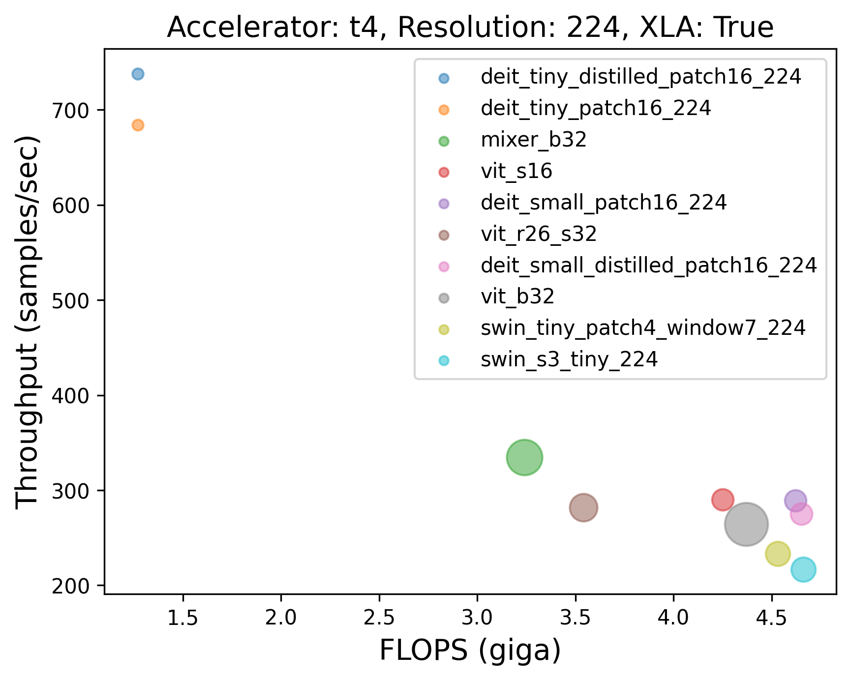 π‘ One particularly interesting finding here is that models having more FLOPs or more number of parameters aren't always slower than the ones having less FLOPs or less number of parameters. Take the plot corresponding to A100, for example. We notice that VGG16, despite having more FLOPs and more number of parameters, is faster than say, ConvNeXt Tiny. This finding is in line with The Efficiency Misnomer. Here's another figure further presenting evidence that larger models are always not slower than the smaller ones: