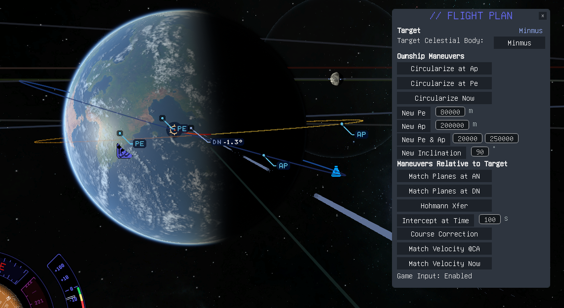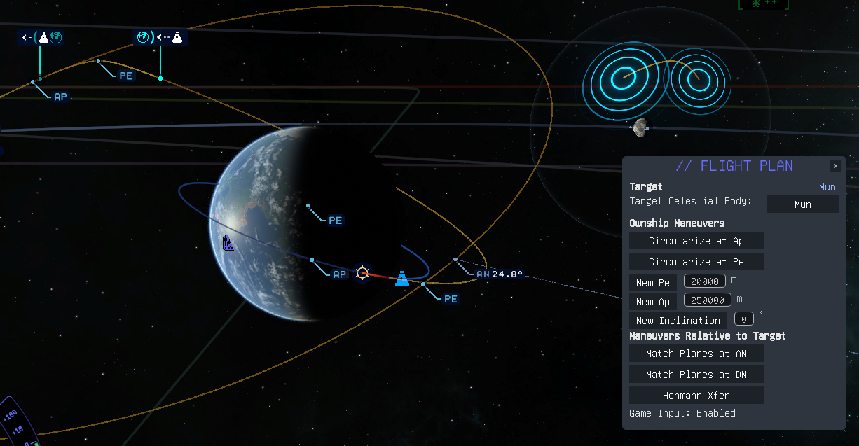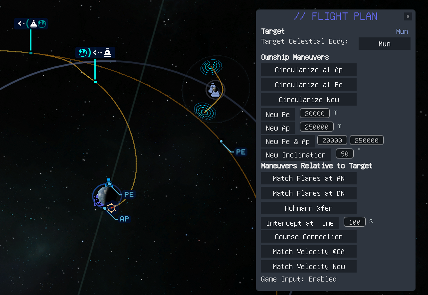 - InterceptTgt(burnUT, deltaUT, burnOffsetFactor): Calling this method will create a maneuver node at the specified time to intercept the currently selected target at the time of deltaUT from now.
