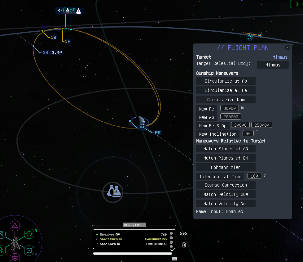 The Flight Plan GUI will always display all Ownship maneuvers available in the current orbital situation. These are maneuvers that don't require a target and so are relative to your current vessel's orbit alone. Each Maneuver Type may be customized by making a selection from the Burn options menu (right below the Celestial Target Selection Menu). For example, selecting Circularize as the Maneuver Type will result in having Burn Time options for at the next Ap, at the next Pe, at an altitude, and after a fixed time. In the case of the latter two options, these will cause an additional input field to be presented where you can specify the Maneuver Altitude or Time From Now.