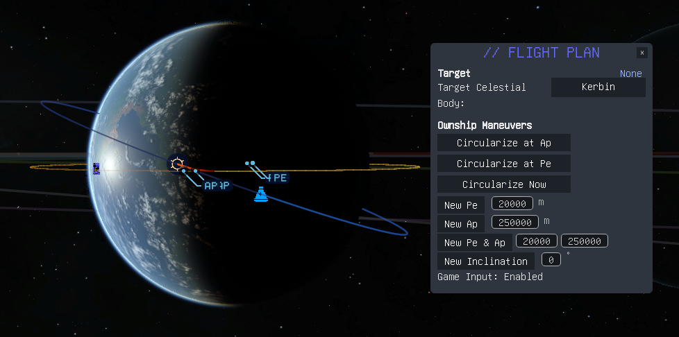 Flight Plan employs a tabbed interface to help organize its features. The list of available tabs updates dynamically based on your current situation. Some tabs will always be available (e.g., Ownship Maneuvers and Resonant Orbit Maneuvers), while others will be offered to you based on the orbit you're in and the type/location of your currently selected target. For example, if your current target is another vessel, and that vessel is in orbit about the same body as your active vessel, then the Target Relative Maneuvers tab will be available to you and it will have the sorts of maneuvers that are configured relative to a target (e.g., Match Planes with the target, etc.).