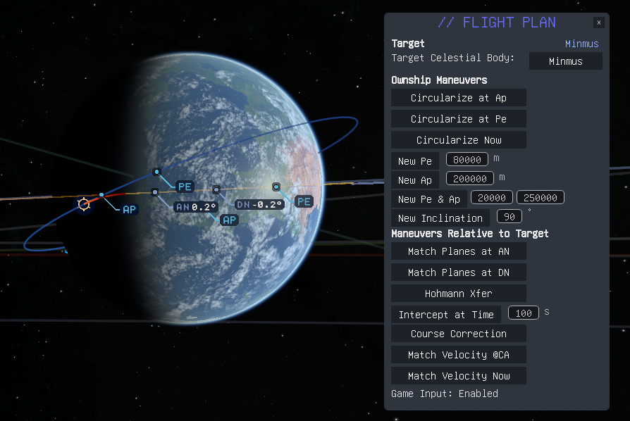 - To prevent things you type in a user input field from passing through to the game and affecting things in odd ways, the game input is automatically disabled when you click inside a text input field. This will cause the game to not respond to your mouse or to anything you type, although you can freely type what you need into the input field. Typing a "." as part of a decimal number will not increase your time warp setting, and using the 1 and 2 keys on your number pad will not mute the game or the music. To restore full functionality for keyboard and mouse inputs simply click anywhere else other than the text input field. Closing the Flight Plan GUI will also have this effect.