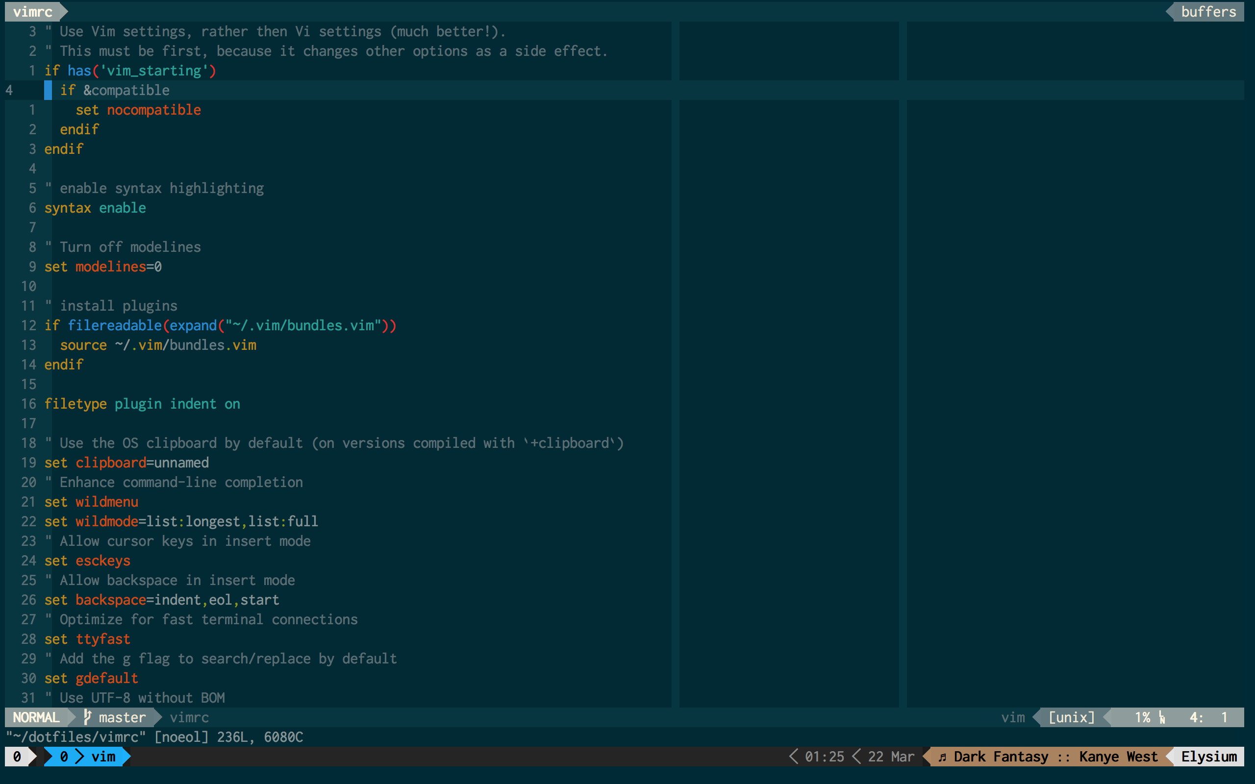 These are my dotfiles. There are many others like them, but these ones are mine. My dotfiles are my best friends. They are my life. I must master them as I must master my life. Without me, my dotfiles are useless. Without my dotfiles, I am useless.
