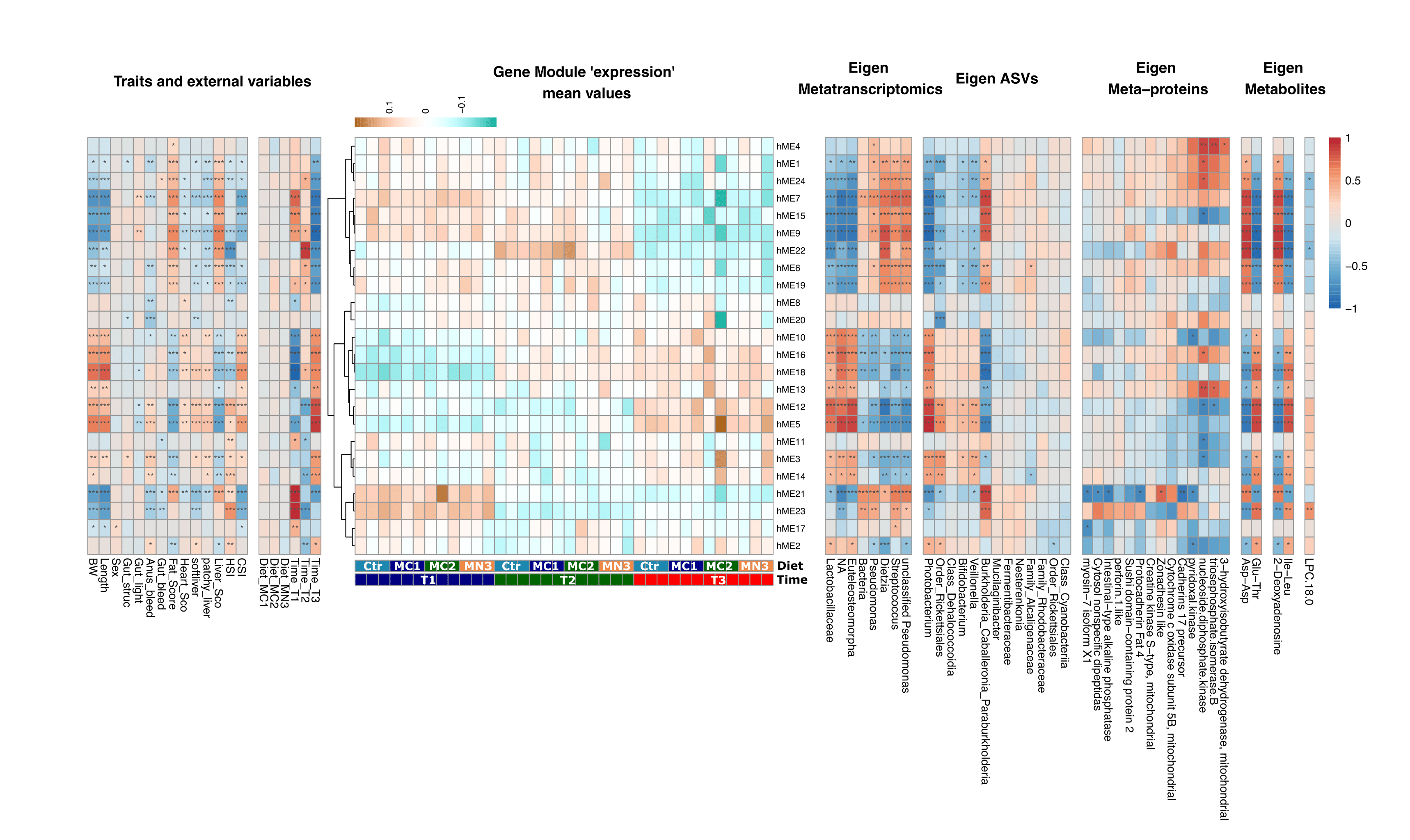 To meet future food demands, more efficient and sustainable animal production systems are needed. Given the crucial importance of the gut microbiota to animal (host) health and nutrition, selective enhancement of beneficial microbes via prebiotics may be a powerful approach for promoting farmed fish welfare and robustness. In this study, we employed three versions of a beta-mannan prebiotic that were fed to Atlantic salmon and explored the combined responses of both gut microbiota and the host from freshwater to seawater life stages. We have used weighted gene co-expression network analysis (WGCNA) of host RNA-seq and microbial 16S rRNA amplicon sequencing data to identify biological interactions between the gut ecosystem and the host. We observed several microbial and host modules through WGCNA that were significantly correlated with life stage, but not with diet. Microbial diversity was highest in the early life of Atlantic salmon and decreased over time. In particular, Lactobacillus and Paraburkholderia were the dominating genera and showed the highest correlation with host modules. Our findings demonstrate that salmon-microbiota interactions are mainly influenced by life stage, while further research is required to determine whether supplementation of selected prebiotics to diet can be used to modulate the salmon gut microbiota for improving host health and production sustainability.