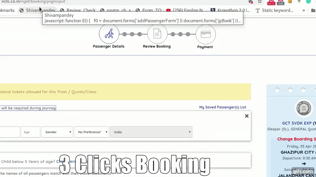 a = document.querySelectorAll("input[placeholder*='Name']"), b = document.querySelectorAll("input[placeholder*='Age']"), c = document.querySelectorAll("select[formcontrolname*='passengerGender']"), d = document.querySelectorAll("select[formcontrolname*='passengerBerthChoice']"), d1 = document.querySelectorAll("select[formcontrolname*='passengerFoodChoice']");
