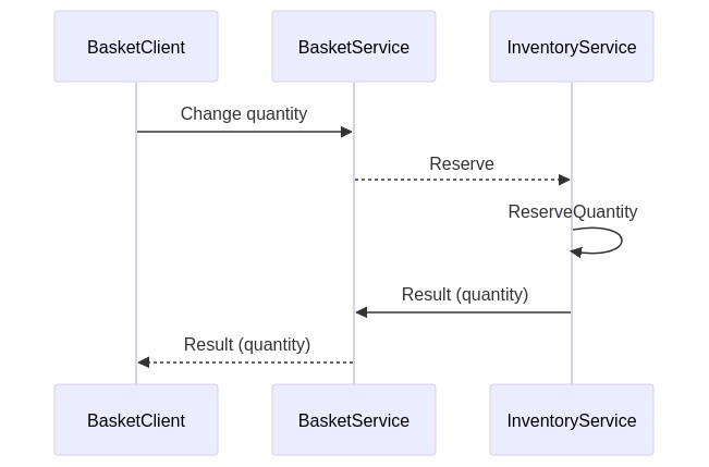 For service to service communication we can leverage graphql. The follow example shows how to create a client for the basket service, which needs to synchronously call the inventory to reserve product items. Consider the following activity diagram.