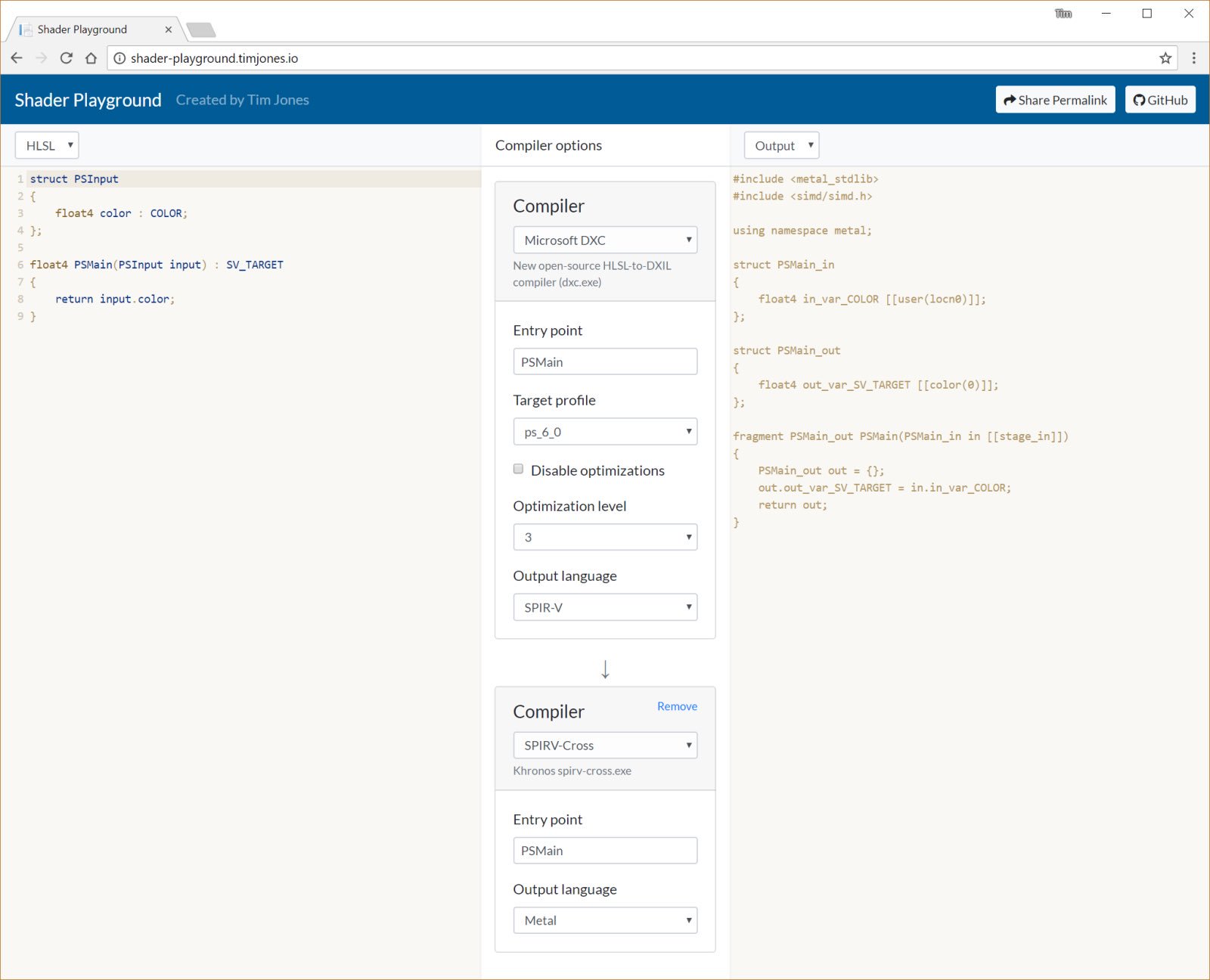 Shader playground website for exploring HLSL, GLSL, SPIR-V compilers