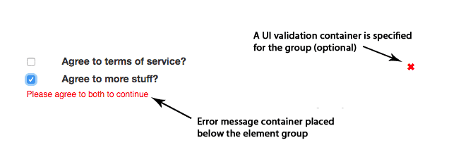 Specify a target for field invalid error messages. Required for use with radio buttons and multi-value checkboxes, but can also be used to override default automatic behavior on any field. Details |