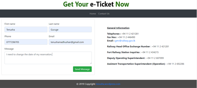 In this web application users can provide the start and the destination locations, train, class, time, ticket quantity and the date of booking. Users can pay using credit/debit cards or by mobile phone, in which the amount is added to the mobile bill. If the user chooses card payment, the confirmed booking details will send to the email of the user by using “nodemailer” email service. If user chooses mobile payment the booking details will send to the entered mobile number using “Twilio” mobile service.