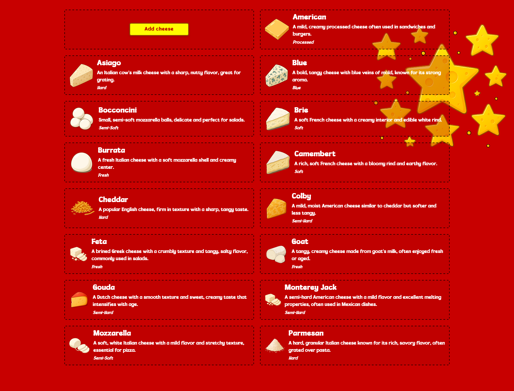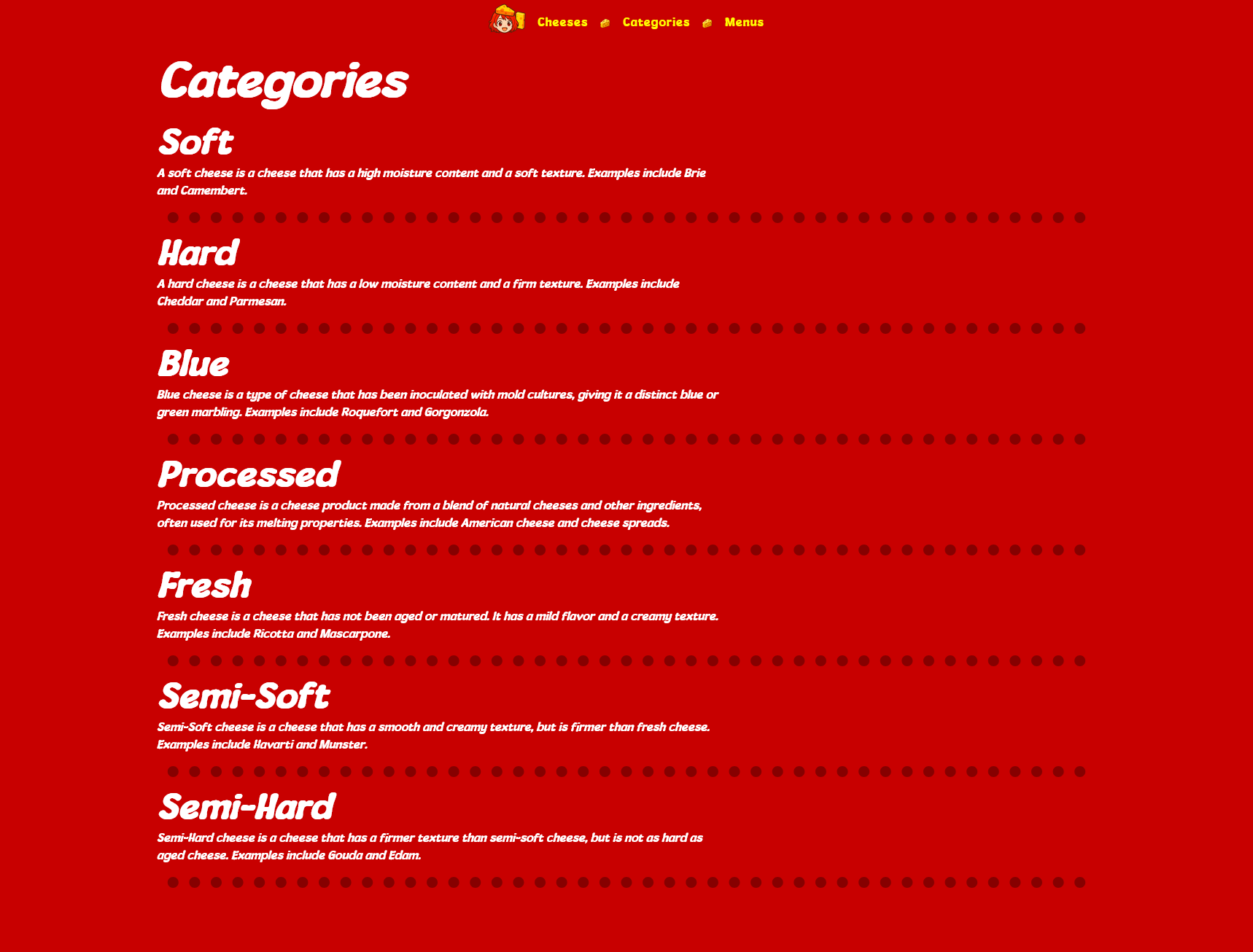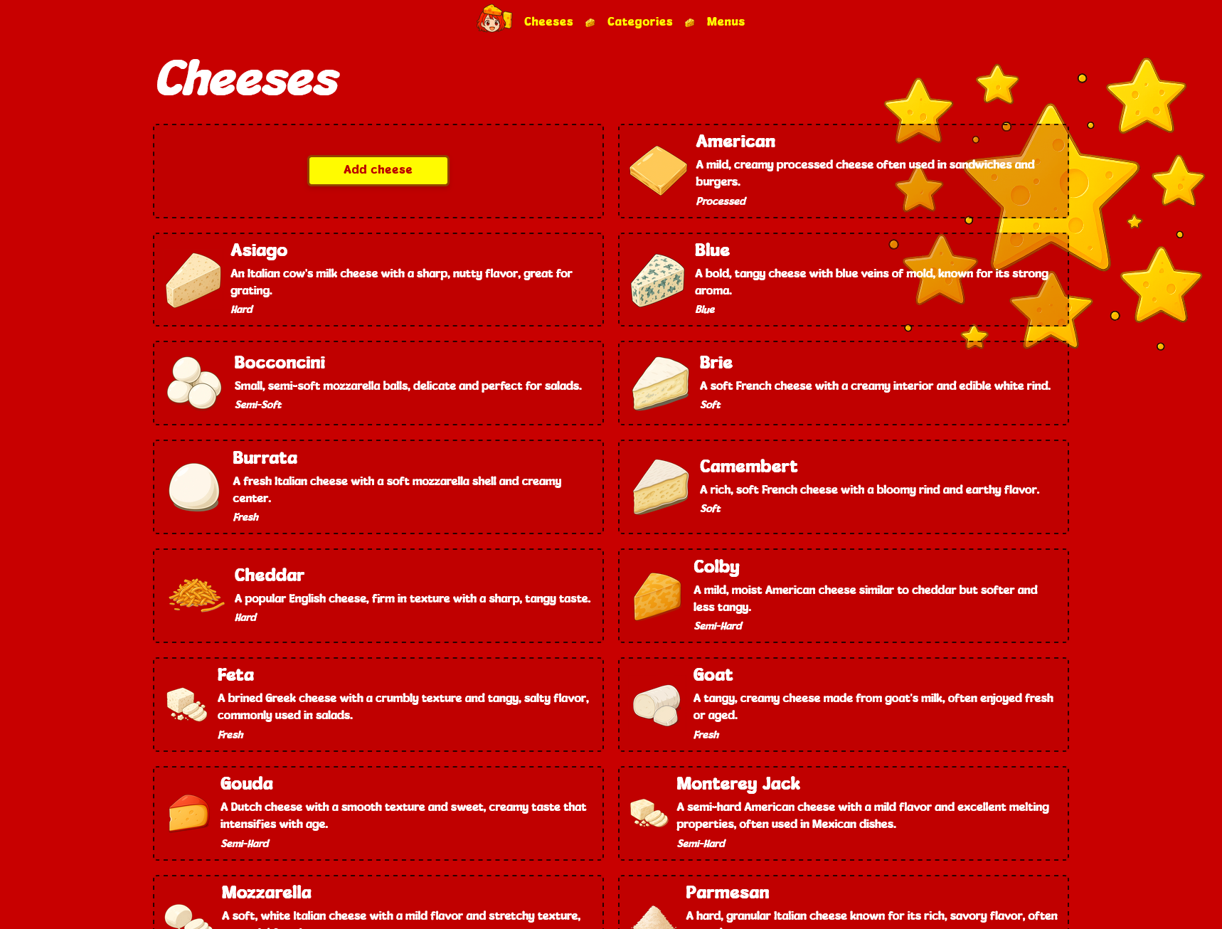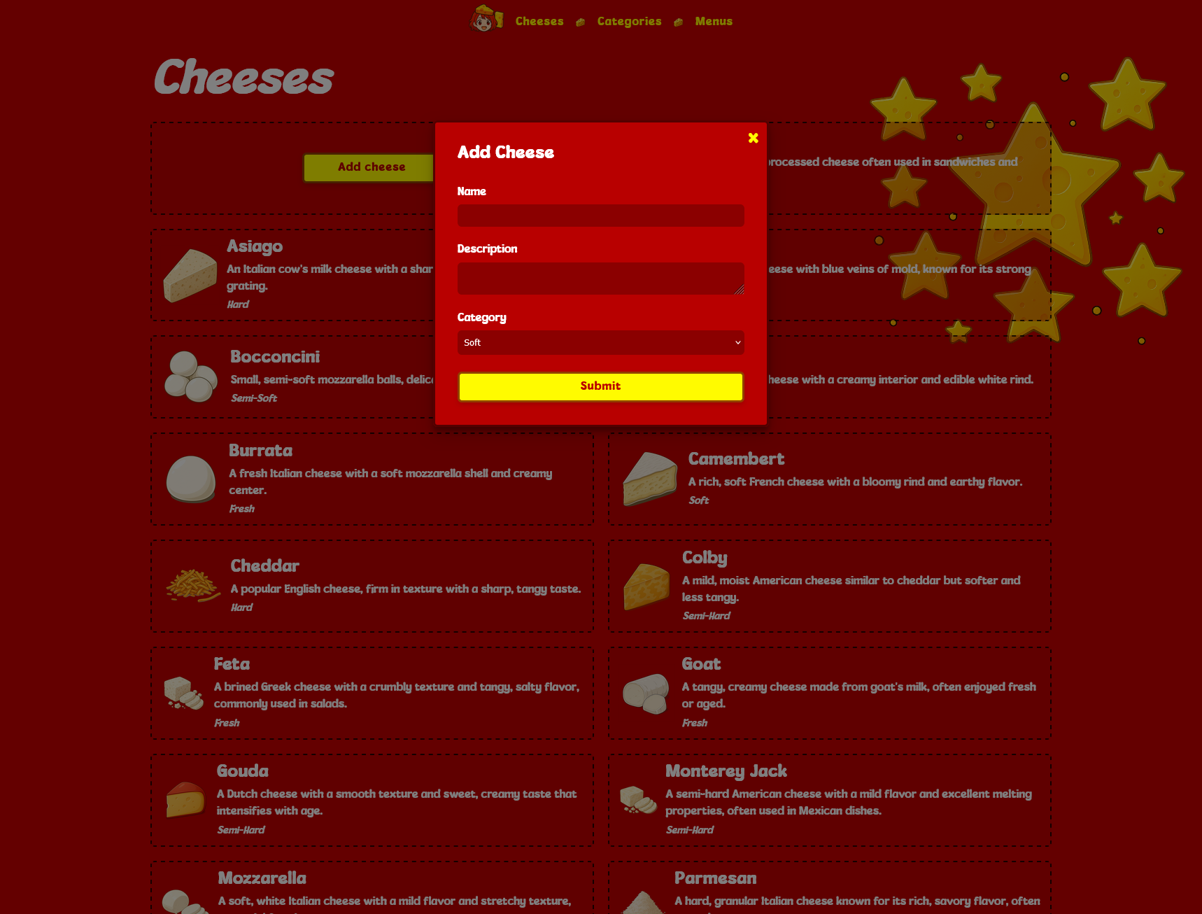 This application was originally an optional CRUD exercise for LaunchCode's LC101 (2018). It was originally built using Java, Spring Boot, Thymeleaf, and MySQL. The end result was an app that allowed users to create, edit, and delete cheese items, cheese categories, and cheese menus. I have since then rewrote the application to learn Ruby and Ruby on Rails. Currently, I managed to redesign the UI and implement some foundations in Ruby and Ruby on Rails, which I consider sufficient for the purposes of learning.