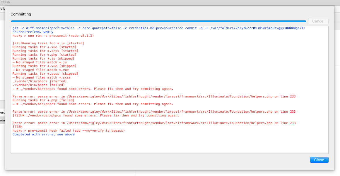 PHP linting is passing when commiting a PHP file via the command line, but not in Atlassian SourceTree.  <img width="601" alt="screen shot 2017-12-04 at 16 52 20" src="https://user-images.githubusercontent.com/17161173/33568791-9525136e-d91f-11e7-8d37-dc16d3484c9a.png">