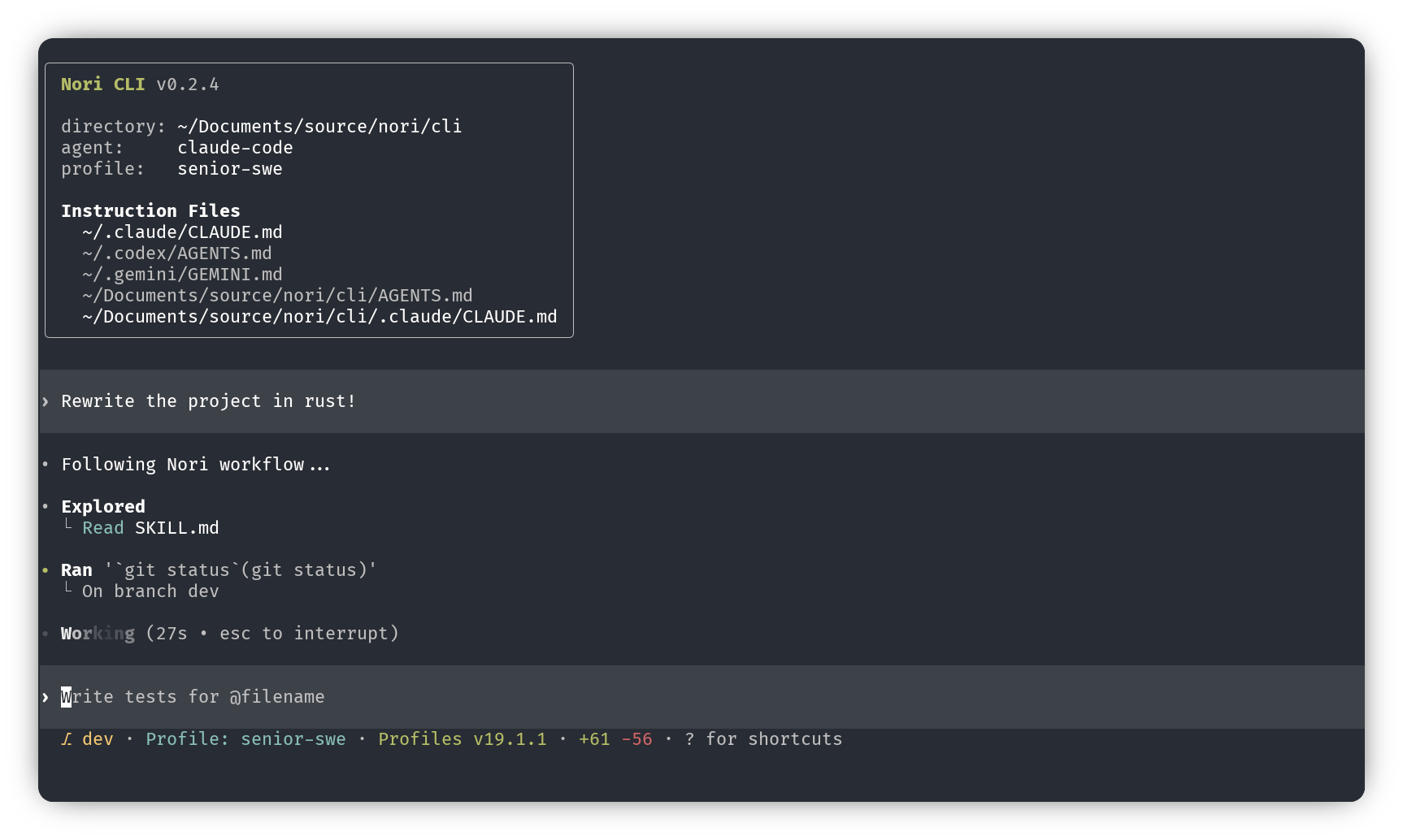 noriThat's it. The agent you choose will rely on existing auth if you have previously been using Claude Code, Codex, or Gemini on this system (and if not, login instructions are below). Nori launches an interactive TUI where you can chat, run commands, and let the AI assist with your codebase.